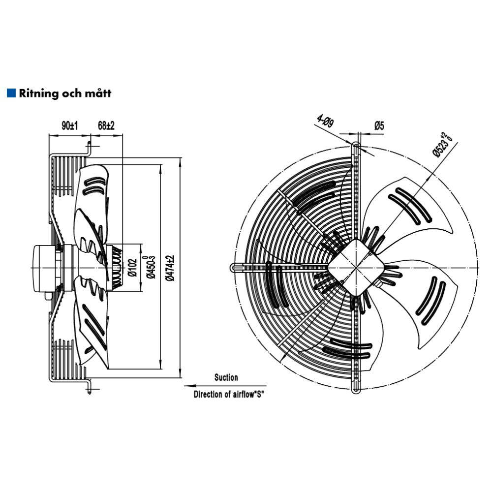AXIALFLÄKT 4-P. 450MM M. KORG SUG. AC 230V