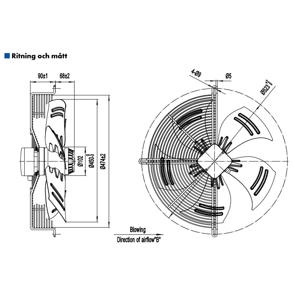 AXIALFLÄKT 4-P. 450MM M. KORG BLÅS. AC 230V
