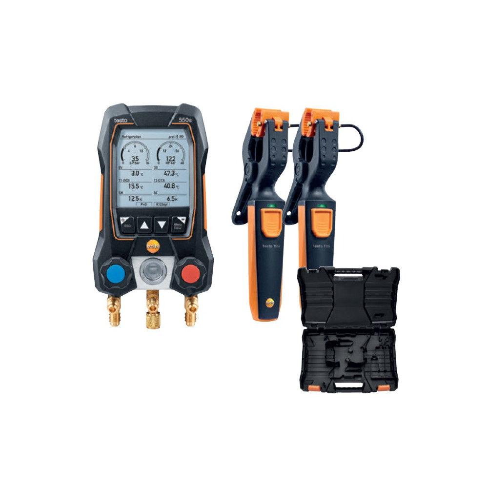 Med det digitala manometerstället testo 550s med Bluetooth och ett 2-vägs ventilblock är du idealiskt utrustad för dina mätuppgifter vid driftsättning, service och underhåll på kylaggregat, luftkonditioneringssystem och värmepumpar.