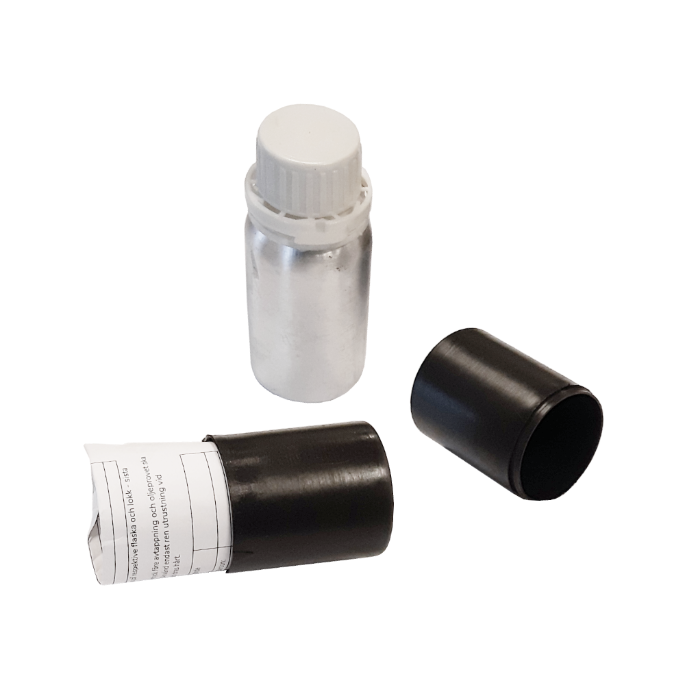 Vid provtagning bör oljan sättas under undertryck före avtappning och oljeprovet ska utsättas för minsta möjliga kontakt med luft. Använd endast ren utrustning vid provtagning. Locket monteras omedelbart och dras hårt.